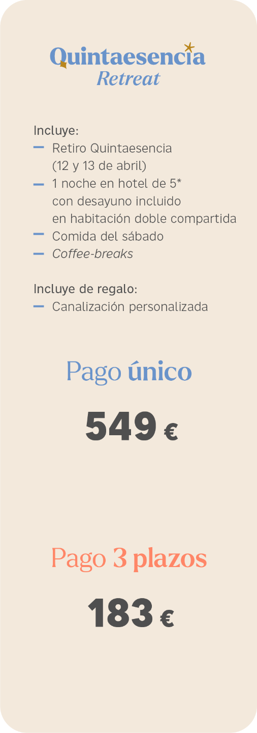 Además, esta experiencia premium incluye un regalo muy especial: antes del retiro recibirás una canalización personalizada con la canalizadora Mar Ramis. En esta sesión individual, recibirás información sobre ti misma que te aportará claridad sobre tu momento vital, con un lenguaje amoroso y libre de juicio, y preparará el terreno para el trabajo intensivo y profundo que realizaremos juntas en Málaga.