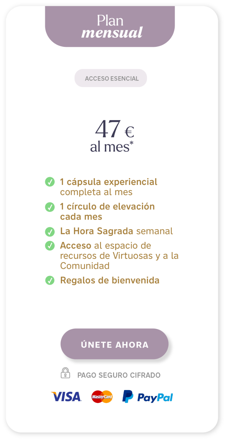 Por formar parte de VIRTUOSAS Privé, disfrutarás de beneficios únicos que irás desbloqueando mes a mes y que hemos diseñado con amor para ti. Nada más entrar recibirás: